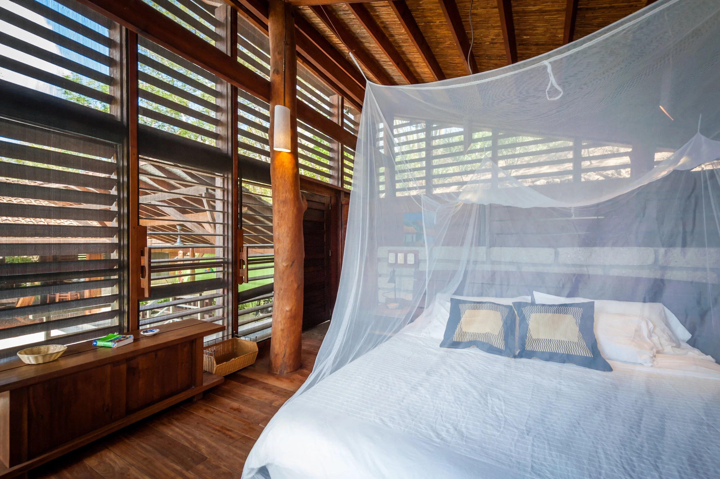 Aquí tendrás todas las comodidades que necesitas: muebles de madera bellamente elaborados, duchas de piedra con ventanas panorámicas con vista al océano y la selva, cocina completamente equipada, ropa de cama y toallas, amplios armarios y toques de diseño únicos. Disfruta nadando en la piscina privada: sal de la suite principal y sumérgete en las frescas aguas con vistas por encima de las copas de los árboles hacia el océano.